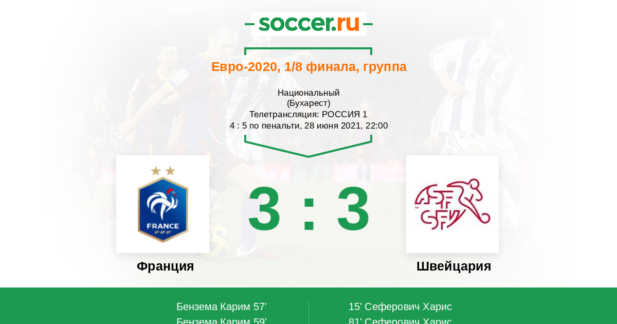 Парни вышли на мировую с уэльсом и проиграли италии, а потом выиграли у турков в решающем поединке. У.льорис, р.варан, к.ленгле, п.кимпембе, п.погба, н.канте, а.рабьо, б.павар, к.бензема, к.мбаппе, а.гризманн швейцария: Обзор матча (28 июня 2021 в 22:00) франция: